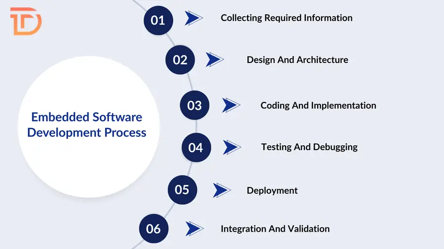 The embedded software development process works on a systematic system that ensures safety, reliability, and performance. It involves various phases: